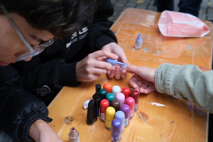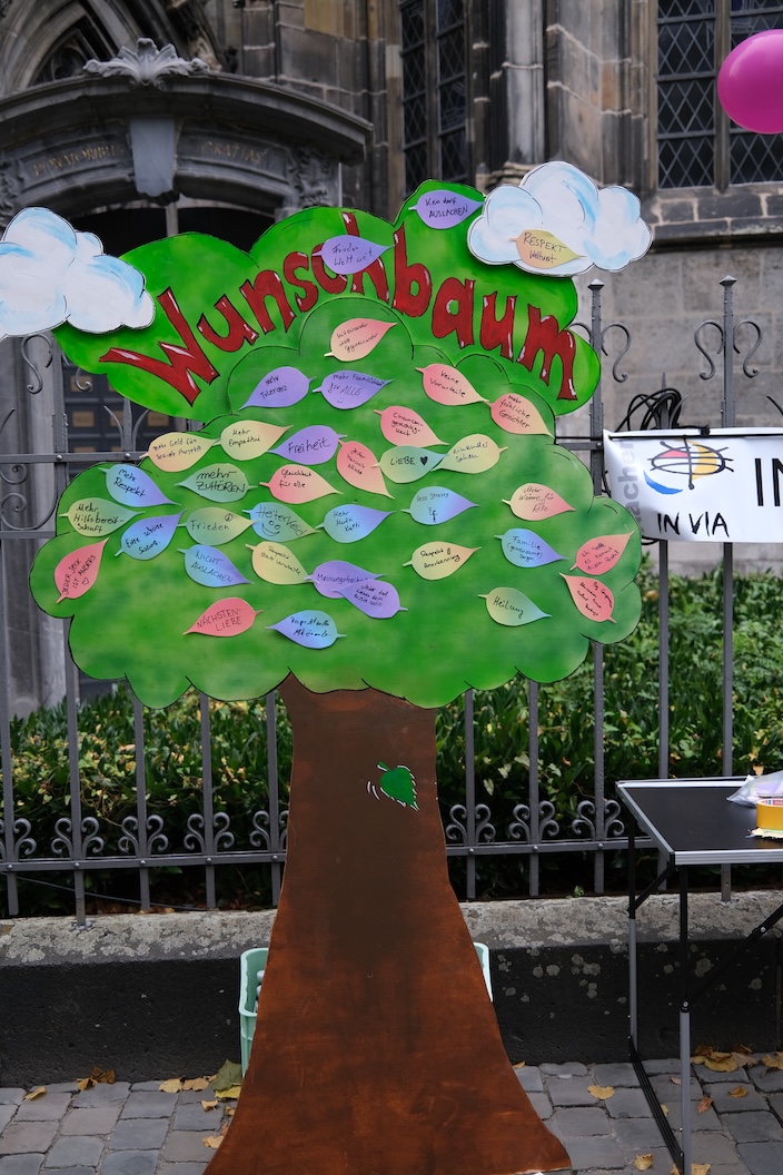 Zwischen Luftballons, Clownseinlagen und frisch aufgepopptem Popcorn ging es lebendigund vielfältig zu: Die. von IN VIA Aachen ausgebildeten Klinikclowns verteilten Sticker und mit Helium gefüllte Luftballons, während ein Teildes Hofstaates von Prinzessin Anne I. nicht nur eine Zirkuskiste zum Ausprobieren aufstellte, sondern auch kostenlos Popcorn anbot – ermöglicht durch den Strom, den der Dom zur Verfügung stellte. An einem Wunschbaum konnten Teilnehmende sowie Passantinnen und Passanten ihre Wünsche für ein vielfältiges Miteinander hinterlassen. Bunte Fingernägel setzten ebenso Zeichen wie eine kleine Installation zu verschiedenen Diskriminierungsformen, die viele anregende Gespräche eröffnete.